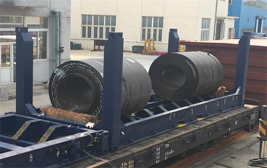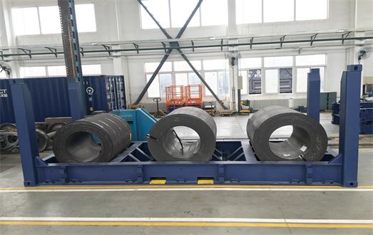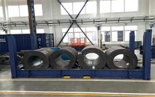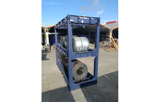 20英尺35噸臺架式卷鋼集裝箱是為滿足卷鋼海上運輸的需求,且能便于公鐵、鐵海多式聯運和堆場儲存的一種臺架式集裝箱,可以采用單排、雙排靈活的組合方式,可裝2-8件卷鋼,最大總重為35噸。卷鋼有防雨要求時,可在裝載后為卷鋼苫蓋防雨裝置。
